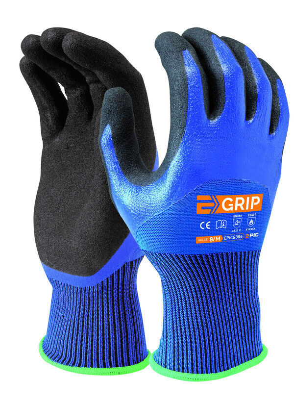 Gants support tricoté polyamide/spandex. Jauge 15. Double enduction GRIP (nitrile NBR + micromousse de nitrile) sur la paume et 3/4 dos. Poignet avec serrage élastique. Utilisés pour les travaux en milieux très gras et très huileux.