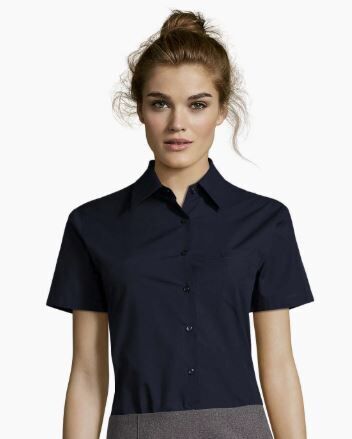 Qualité POPELINE POLYCOTON 65% polyester - 35% coton Poids : 105 g/m² couleur, 95 g/m² blanc Style : Coupe cintrée Manches courtes Col renforcé Patte 7 boutons ton sur ton Poche côté c?ur